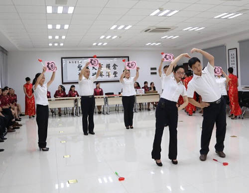该支部下辖五大部门被分成四支参赛队,即董事长办公室代表队、培训学校及证劵事务部代表队、荆门逸居酒店前厅队、荆门逸居酒店餐饮队。按照抽签顺序,首先出场的是培训学校及证劵事务部代表队,别看这支只有7人的参赛队,他们巧妙利用歌曲两段式重唱的特点,将整个手语舞以前后两种不同的风格呈现在观众面前,配合声光舞相互融合,令众人眼前一亮。随后出场的荆门逸居酒店前厅队,全队以大红旗袍装亮相舞台,通过舞蹈的灵活变换,摆出“丰”字队形,将她们的参赛主题“大地的丰收·感恩洋丰”诠释地淋漓尽致。而荆门逸居酒店餐饮队则以“点亮心灯·感恩生活”为主题,采取回归本寓的形式,借助蜡烛照亮心形,表达感恩。最后出场的是董事长办公室代表队,不敢说压轴,但出场式的别出新意瞬即博得满堂喝彩,整齐的队形,规范的动作,也绝对不逊于其他同事,值得一提的是,他们也是四支队伍中参赛率最高的,这靠的是团队意识和不甘示弱的集体荣誉感。