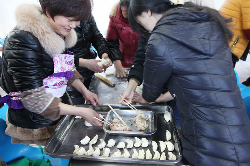 食堂师傅讲授包饺子技巧。全体女职工分成8个小组,饺 子包完后,由食堂师傅评选,第七组、第一组和第二组分别斩获1 、2、3名。