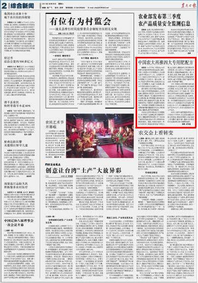 中国农大资环学院设计专用肥配方,充分利用了全国测土配方数据库中有关土壤检测的科研成果,并广泛征询了国内有关重点农业大学、农科院专家教授的意见。据悉,中国农大拟用一年左右的时间,根据全国各地不同的土壤、地力条件、灌溉条件以及作物对养分的需求,设计出约30个权威的专用肥大配方,作物品种涵盖水稻、小麦、玉米、棉花、油菜、果树、蔬菜、甘蔗、烟草、茶叶等各类大宗农作物,达到提高肥料利用率,减少用肥量,提高产量和作物品质,节支并增产增收。