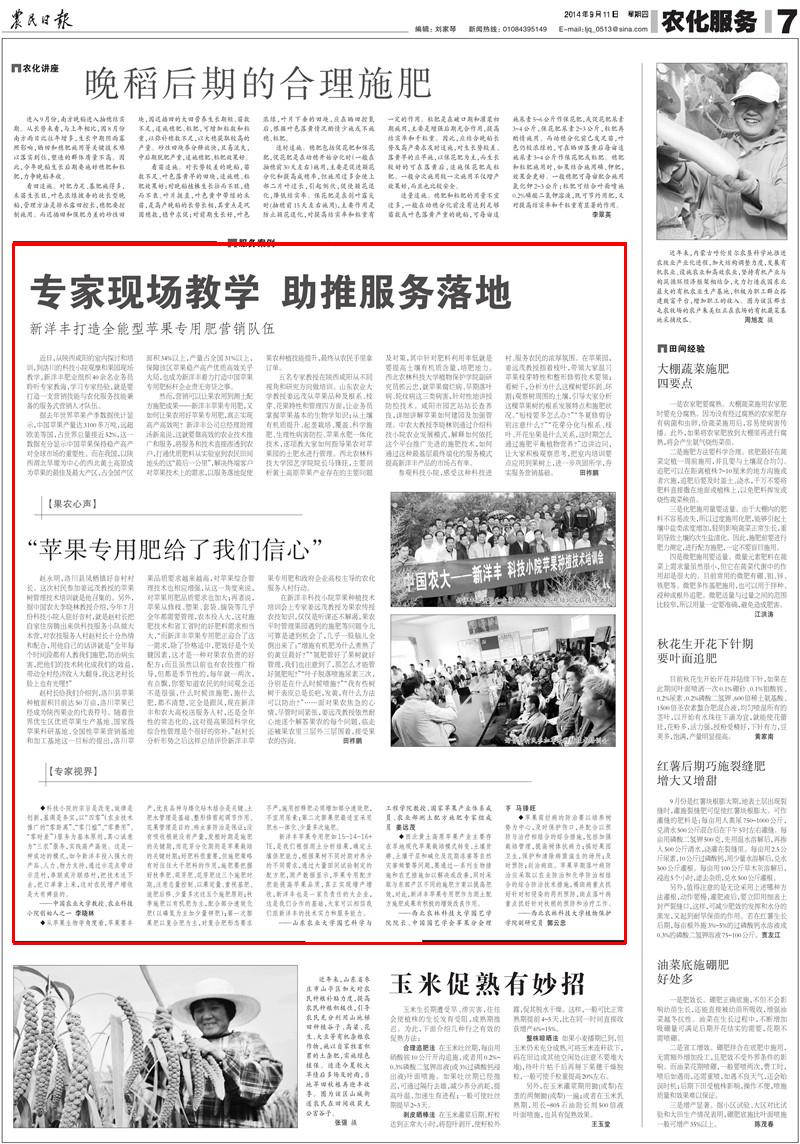 然而,营销可以让果农用到测土配方施肥成果--洋丰苹果专用肥,又如何让果农用好苹果专用肥,真正实现高产高效呢?这就要靠高效的农业技术推广和服务,将服务和技术直接渗透到农户,打通优质肥料从实验室到农民田间地头的这“最后一公里”,解决终端客户对苹果技术上的需求,以服务落地促使果农种植技能提升,最终从农民手里拿订单。