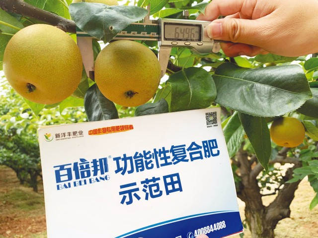 针对这一现象,伟德国际1946技术员结合当地土壤情况及梨树需肥特性,制定了一套百倍邦黄花梨套餐肥。即基肥施用锌磷美17-17-17复合肥2斤/棵+海藻菌剂10斤/棵;萌芽期施用百倍邦18-9-18海藻复合肥4斤/棵;壮果期再施用百倍邦13-5-27海藻复合肥5斤/棵,并在陈志勇家梨园选取40棵黄花梨进行示范,其他树仍然按陈志勇的老习惯施用其他厂家复合肥2次,结合树势每次6~10斤/棵。