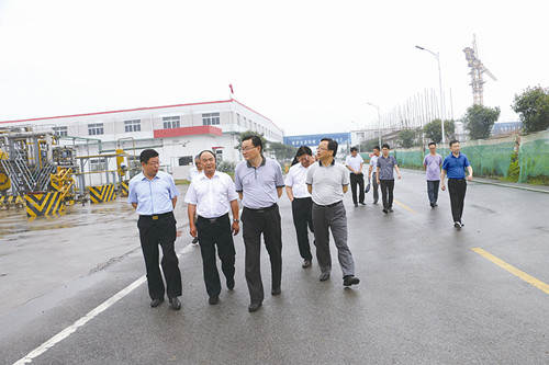 5月30日, 在第17个安全生产月到来之际,江西九江市副市长罗文江(前排左三)及相关部门领导在瑞昌市市委书记郭小云(前排右一)的陪同下深入江西伟德国际1946生产一线检查安全生产工作。