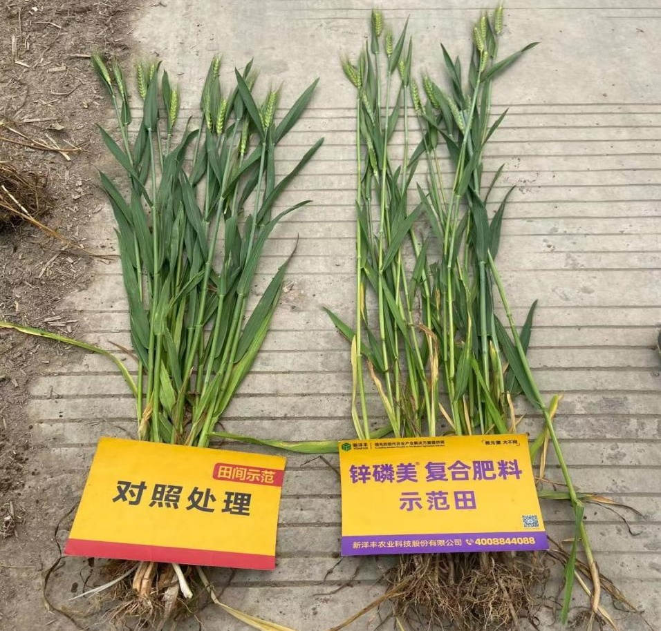曾义根的5亩小麦全部用的是锌磷美24-15-6小麦专用肥,每亩用肥40kg,后期没有追加尿素;旁边一位农户的小麦为对照田,用的是当地常用品牌肥料15-15-15的硫酸钾复合肥,每亩用肥55kg,后期每亩再追施尿素10kg。两块地的小麦品种相同,播种时间相同,其他田间管理也一应相同,但是两边的小麦长势却大不相同。